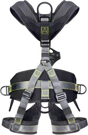 Composición del soporte principal : Aluminio – poliéster | Número de hebillas automáticas : 2 | Número de hebillas no desmontables : 5 | Punto de anclaje anticaídas : 2 – Dorsal – Esternal | Puntos de anclaje de sujeción de trabajo : 2 – Cinturón (delantero) | Puntos de suspensión : 1 | Rotación de 120° | Peso : 2,7 kg