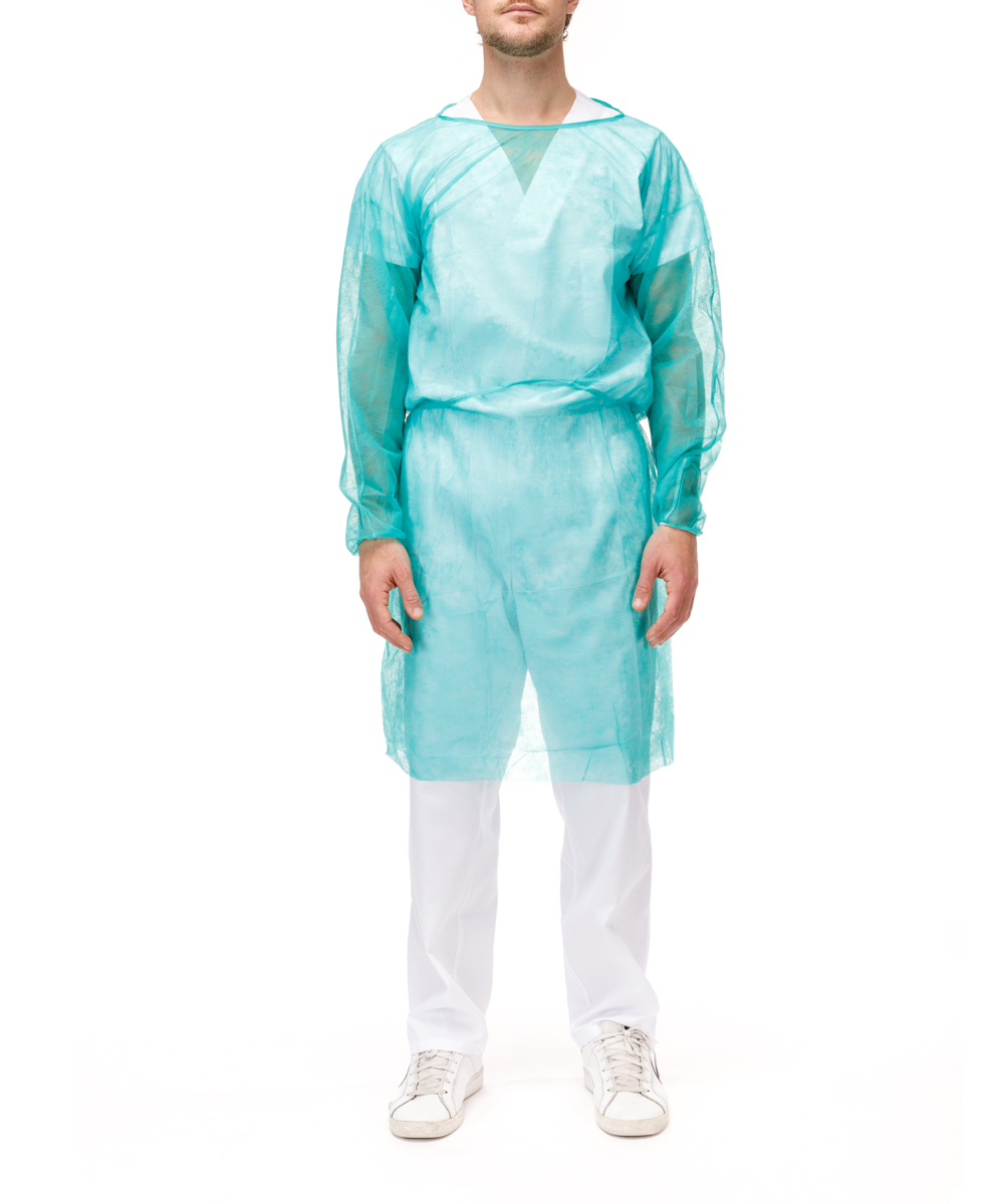 Bata fabricada en polipropileno de 20 gr. Con cierre mediante cintas al cuello y cintura y puños con elásticos, REF. 65450.