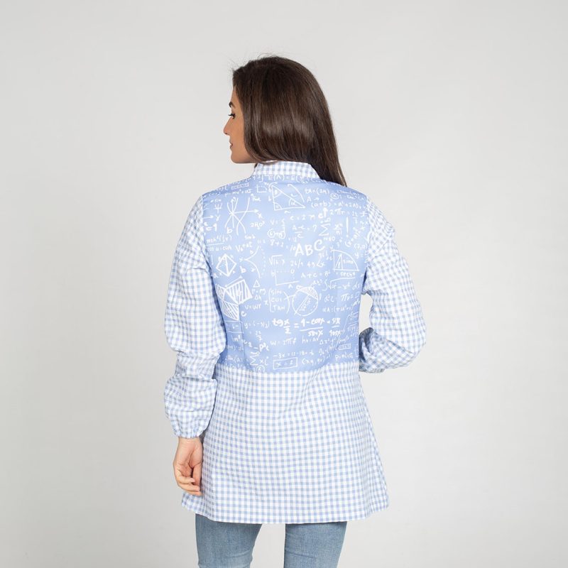 La bata está confeccionada en bambula de cuadros celestes, una mezcla de 65% algodón y 35% poliéster, que combina comodidad, durabilidad y facilidad de cuidado.