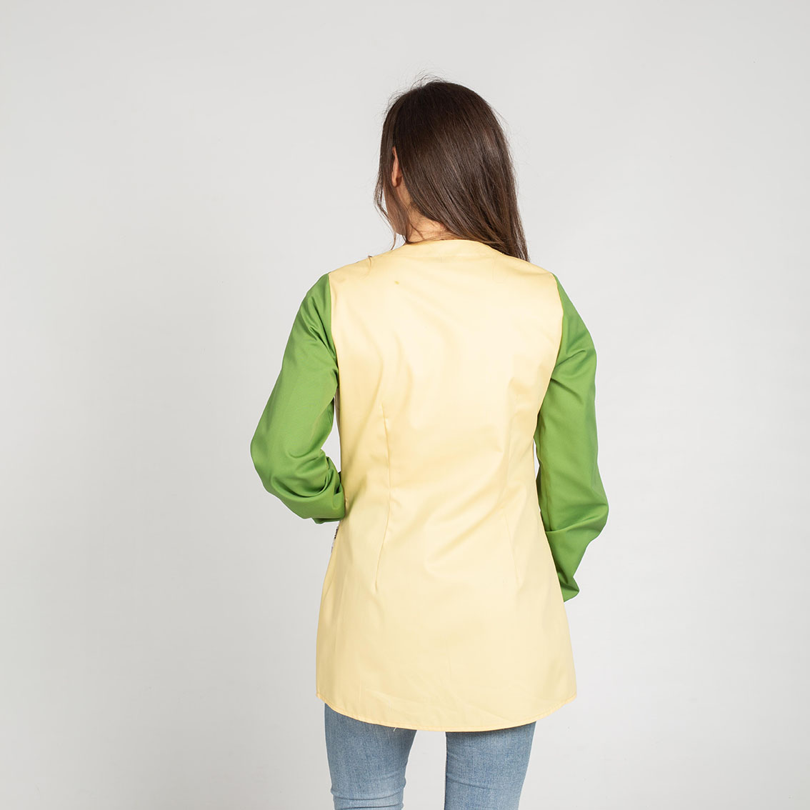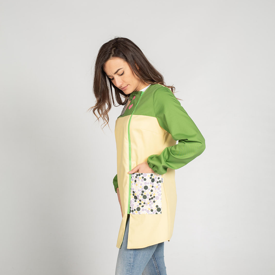 La bata está confeccionada en SARGA de color verde y vainilla, un material duradero y fácil de mantener. Además, cuenta con un estampado en el bolsillo que añade un toque de estilo adicional.