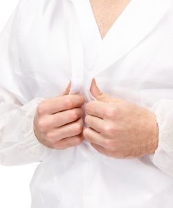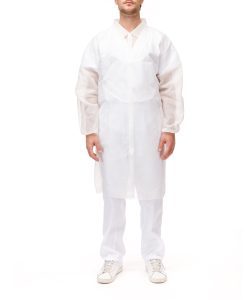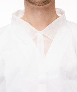 Bata de visita, fabricada en polipropileno de 35 gr, cierre mediante 5 velcros y cuello camisa.