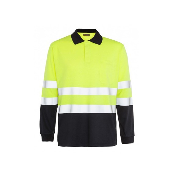 Available on backorder Polo modacrílica punto liso bicolor Clase II manga larga. 1 bolsillo con velcro en pecho, cuello contraste, puño elástico. 2 bandas reflectantes ignífugas termoselladas en torso y mangas.
