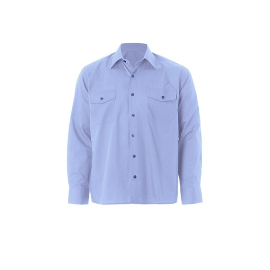 Camisa manga larga, 2 bolsillos con cartera, puños ojal y botón. Canesú y pinzas en espalda. 185 grs.