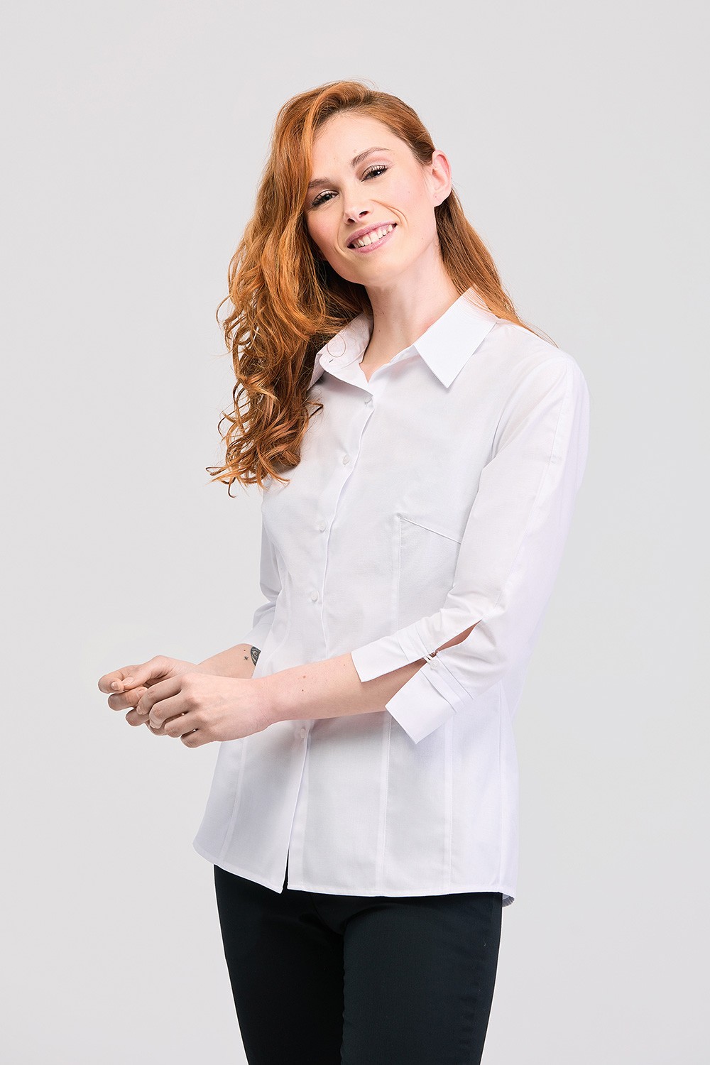 Camisa con estructura fil á fil, un tejido que favorece la transpiración y evita la transparencia de la piel. Refleja una imagen más cercana y relajada que podrás combinar tanto en looks elegantes para agentes comerciales y uniformes de recepcionista de hotel como con el uniforme más casual para camareras.