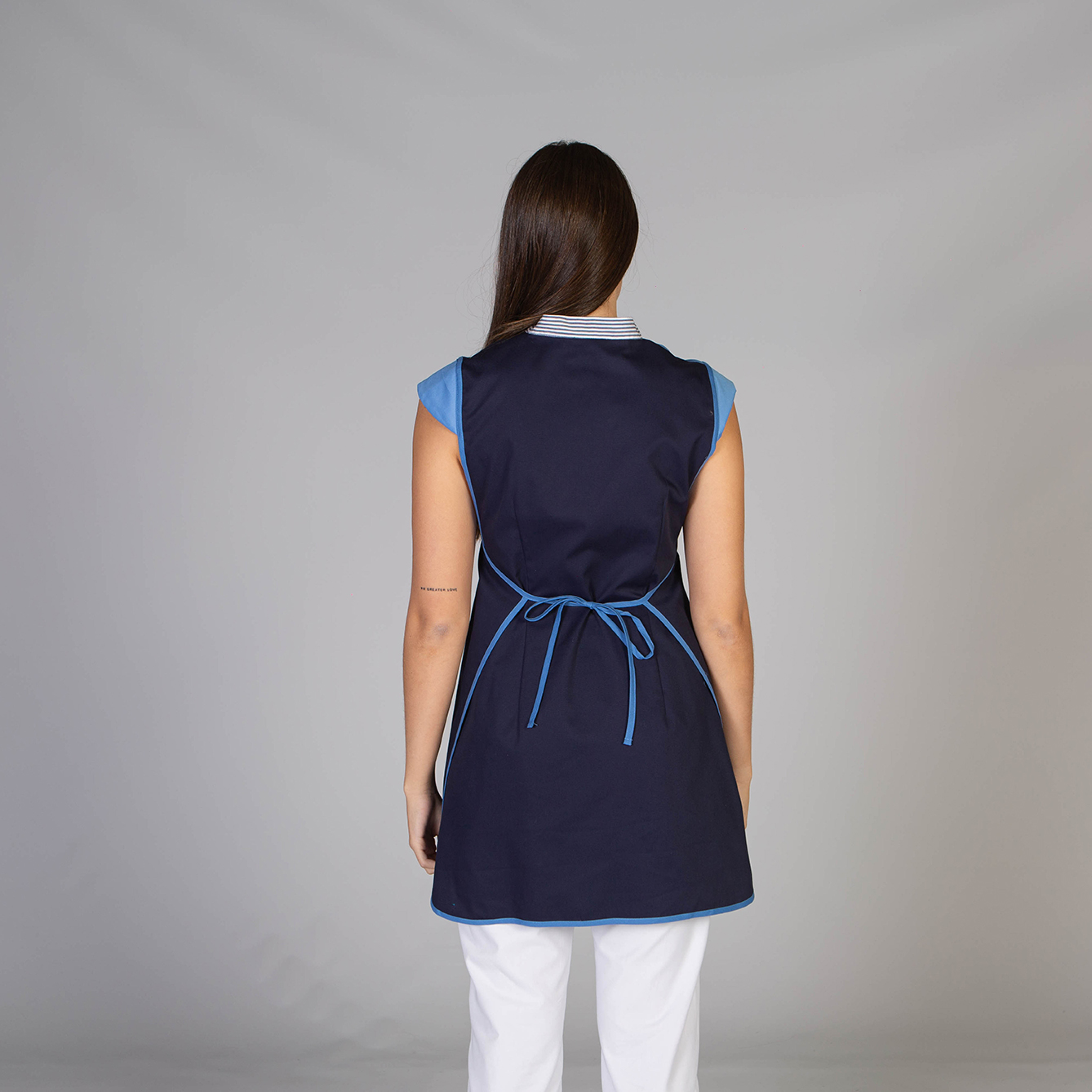 Casulla de mujer tipo estola, con cuello mao. Dispone de un bolsillo central, pinzas en sisas y espalda y tiras laterales para ajustar.