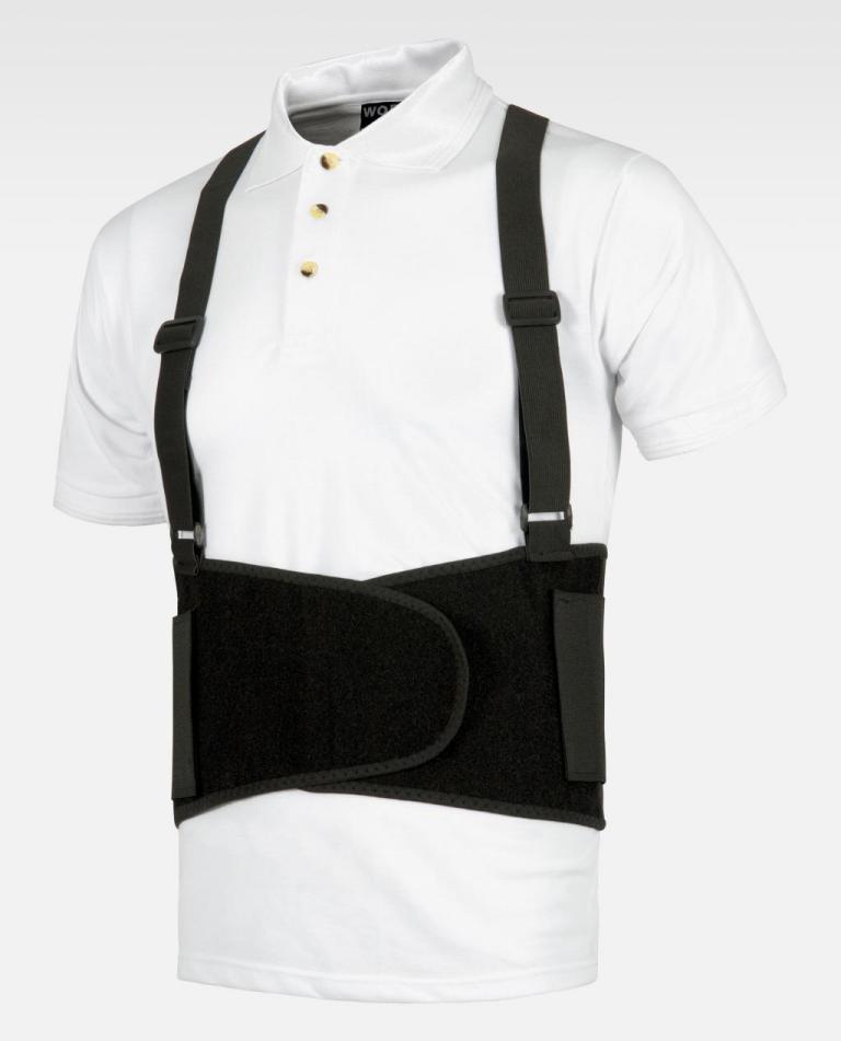 Faja lumbar elástica con tirantes reforzada por ballenas, ajustable con doble velcro.