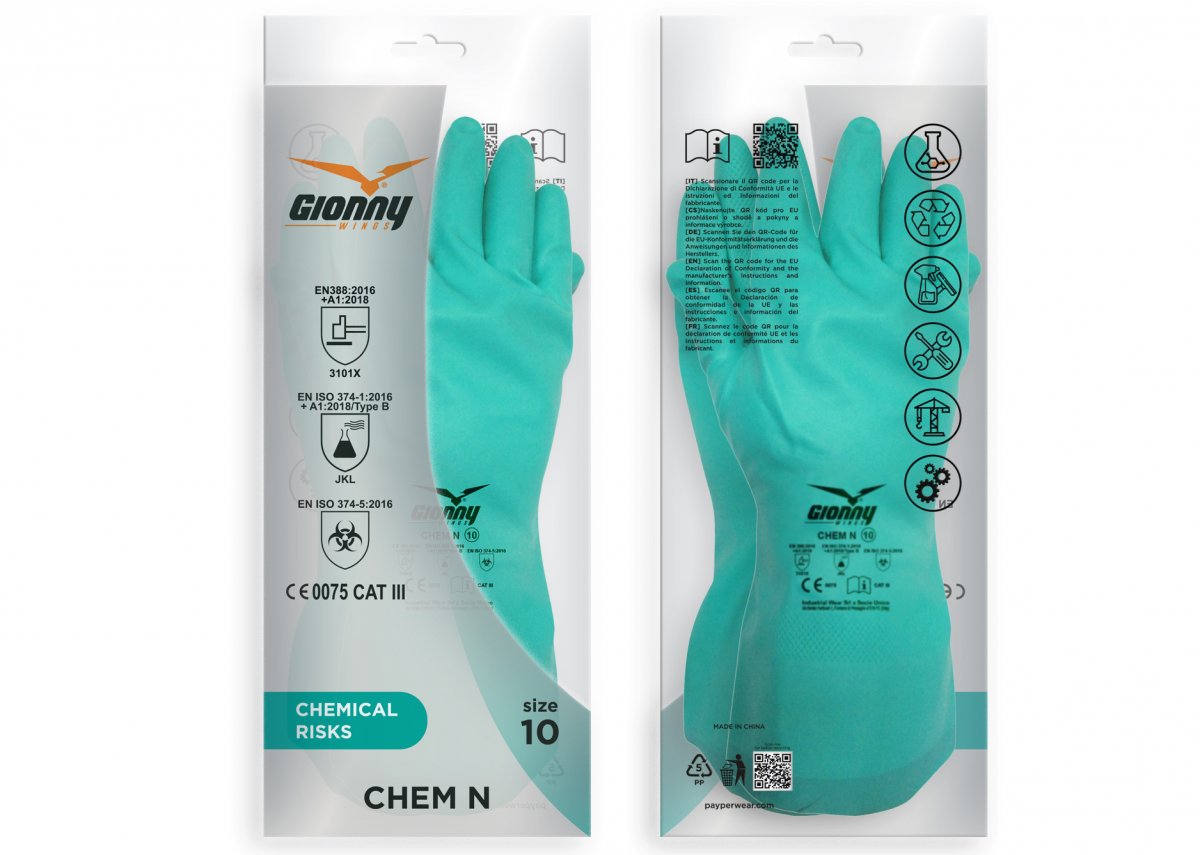 Guante de nitrilo sin soporte con interior flocado de algodón, para protección de riesgos químicos y microbiológicos. Reutilizable (no desechable) – Características: muy resistente, ajuste. Puntos fuertes: comodidad, desteridad, agarre, sensibilidad, precisión, resistente a productos químicos y microorganismos. – Campos de uso: ambientes con presencia de productos químicos agresivos y/o microorganismos y su manipulación. No protege contra la penetración de virus. Unidad mínima de venta: 1 docena (12 pares).