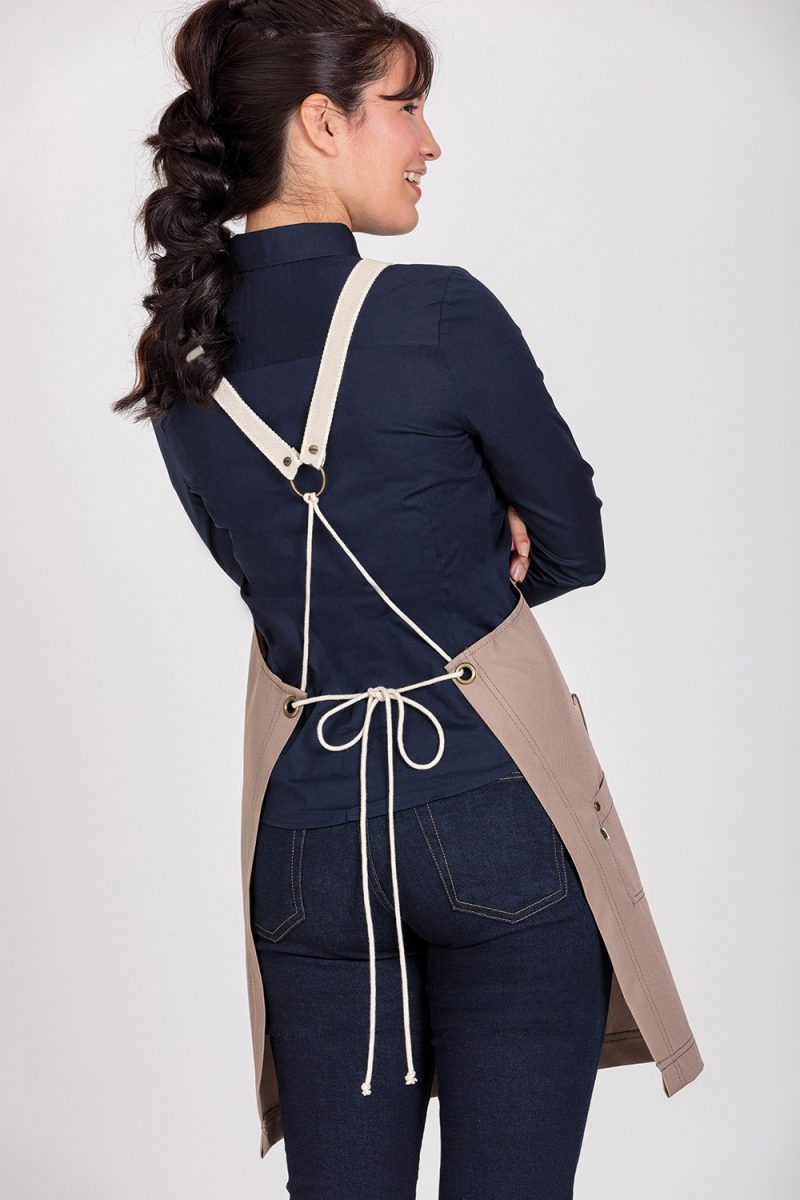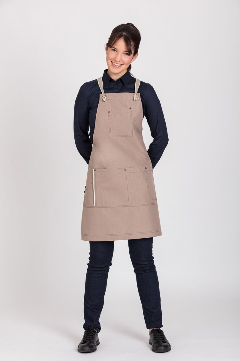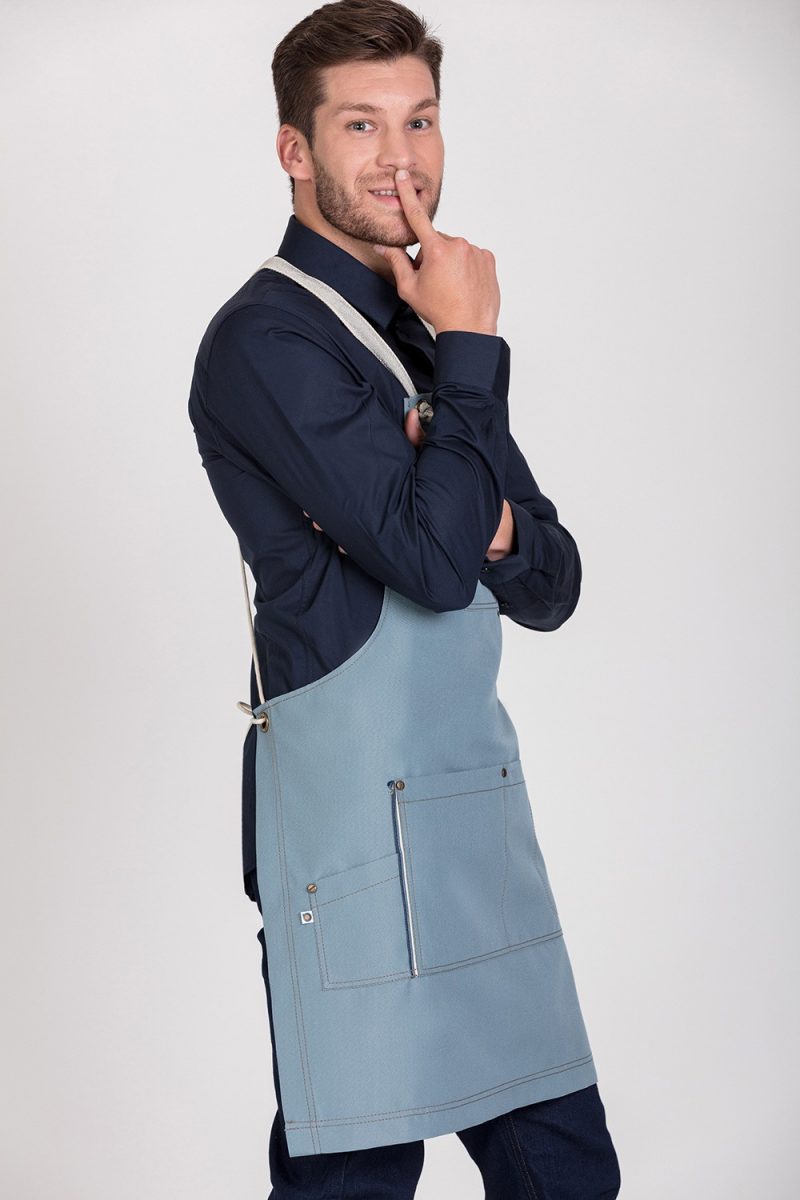 Delantal con peto impermeable, tiene una membrana externa que evita que penetren las manchas líquidas. Con un bolsillo en la parte del pecho y otro grande en la parte posterior. Se ajusta al cuerpo por dos tiras de atar y una cuerdas que se cruzan por la espalda. Además, el tejido permite ser lavado en lavadora doméstica a 30°. La medida aproximada del delantal es de 78 cm de largo x 70 cm de ancho.