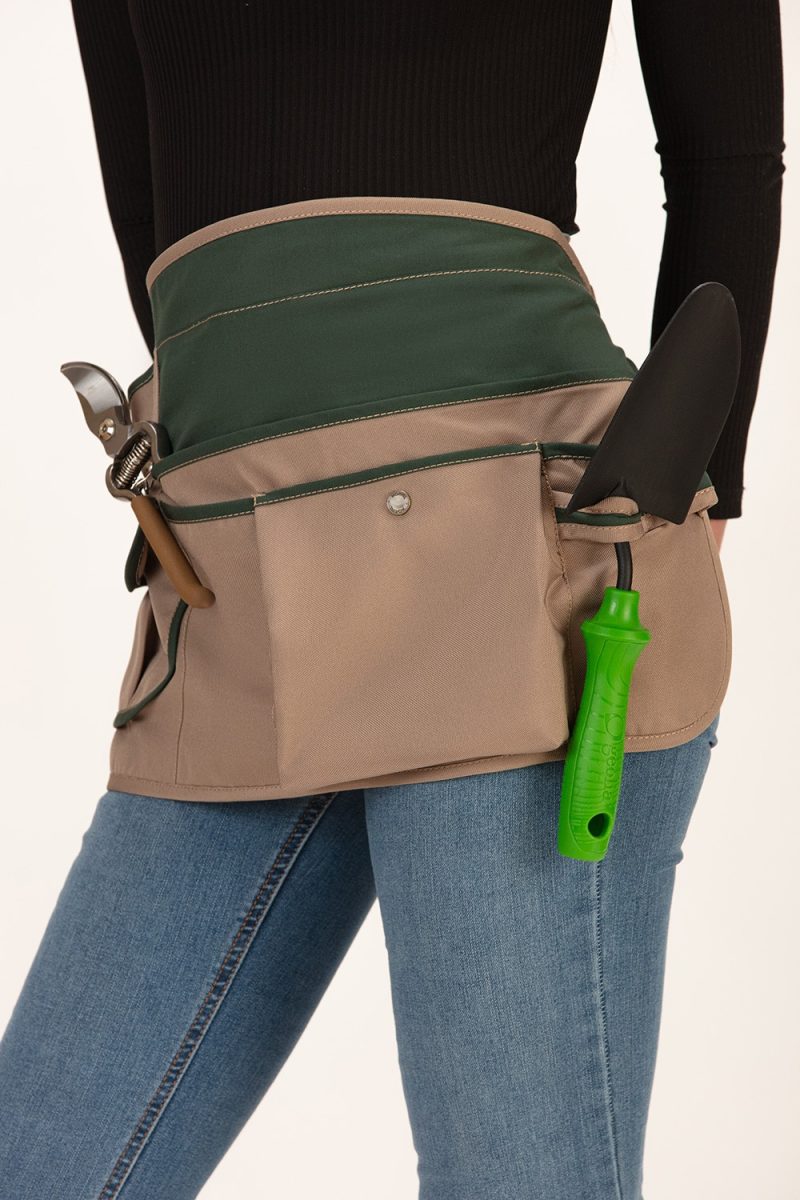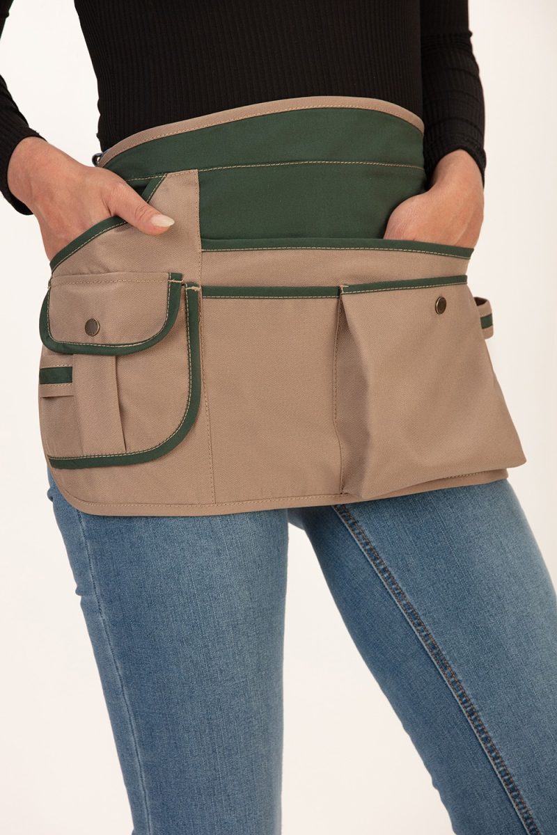 Delantal corto destinado a trabajos de jardinería y mantenimiento. Tiene una multitud de bolsillos y compartimentos en los que poder guardar útiles. Se ajusta al cuerpo con dos tiras para anudar en la cintura. Además, el tejido impermeable repele los líquidos y permite ser lavado en lavadora doméstica a 30°. La medida aproximada del delantal es de cm 30 de largo x 57 cm de ancho..