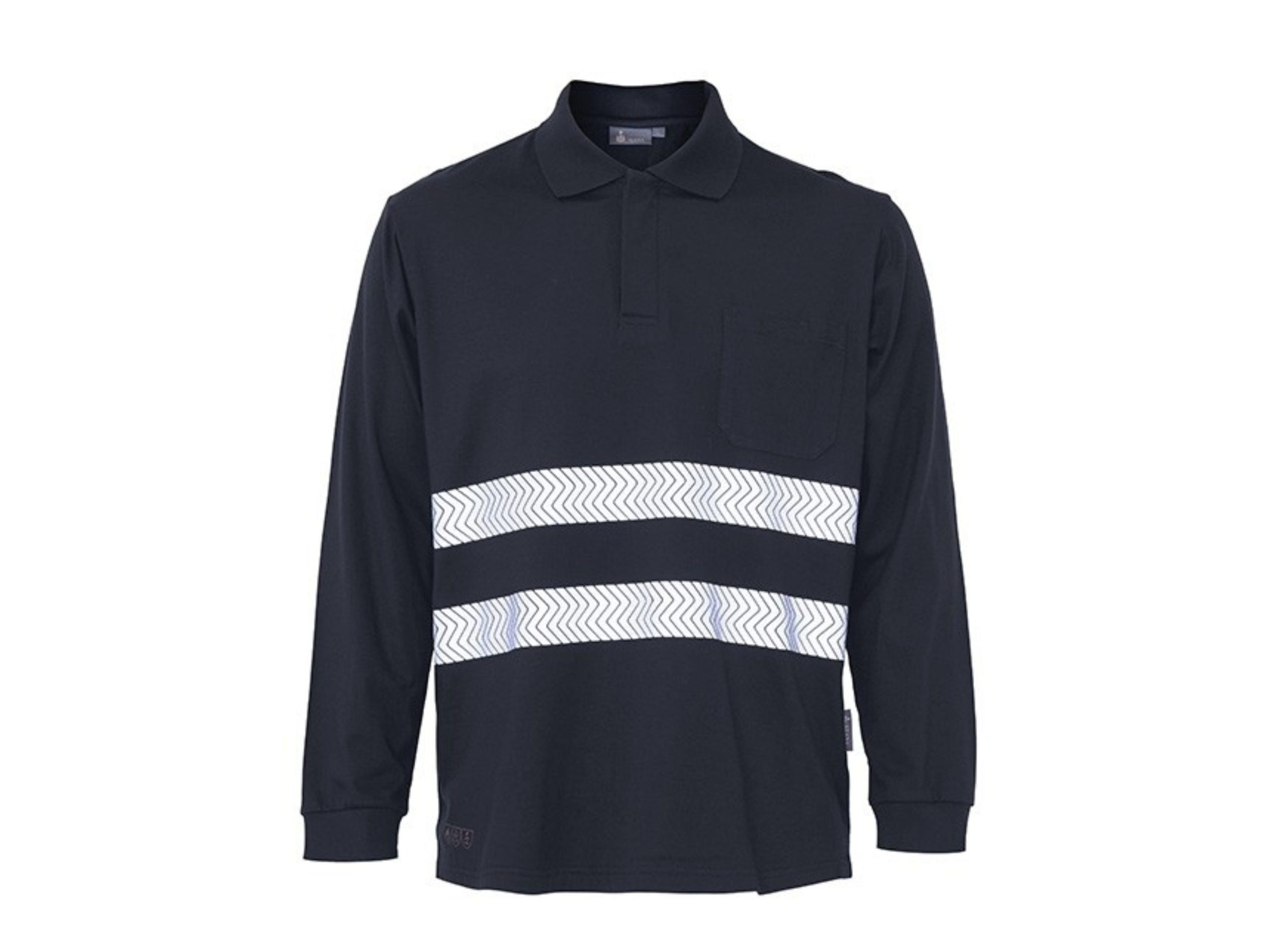 Available on backorder Polo manga larga punto liso ignífuga- Atex. 1 bolsillo con velcro en pecho. Puños elásticos. 2 bandas reflectantes termoselladas discontinuas ignífugas en torso.