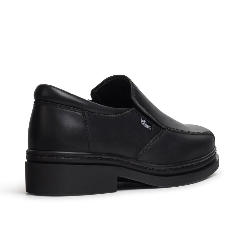 Zapato con cierre de elásticos laterales, de piel micro D’COVER PLUS®, forrado en la pala con microfibra técnica D’DRY®, acolchado en el tobillo para evitar rozaduras. Horma recta de puntera redondeada. Contrafuerte de dureza suficiente para sujetar el calcáneo. Plantilla acolchada de microfibra sobre espuma de poliuretano termoconformado con tratamiento antibacterias y carbón activado. Suela de poliuretano antideslizante de doble densidad, bicomponente de poliuretano y TPU combinados para aumentar el coeficiente de eficacia antideslizante del zapato. Fabricado mediante montado y cosido de seguridad para reforzar la unión de la suela al corte del zapato.